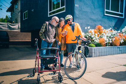 One of Eli Akira Kaufman’s earliest memories is from the back of his parents’ bicycles. As he got older, cycling remained an important vehicle for Eli; it’s how he took in the world, and commuted to work. He’s since become the executive director of LA’s largest cycling and road safety advocacy nonprofit BikeLA – formerly the LA Bicycle Coalition. In addition to focusing his career on cycling advocacy, Eli loves sharing this passion with his family; he bikes regularly with his own children, but his aging parents are no longer able to safely ride a bike due to long-term health challenges. Normally, Eli is the one driving his parents from place to place. But they decided to try out a new kind of ride together: with Eli on his bicycle, and his parents in a Waymo.